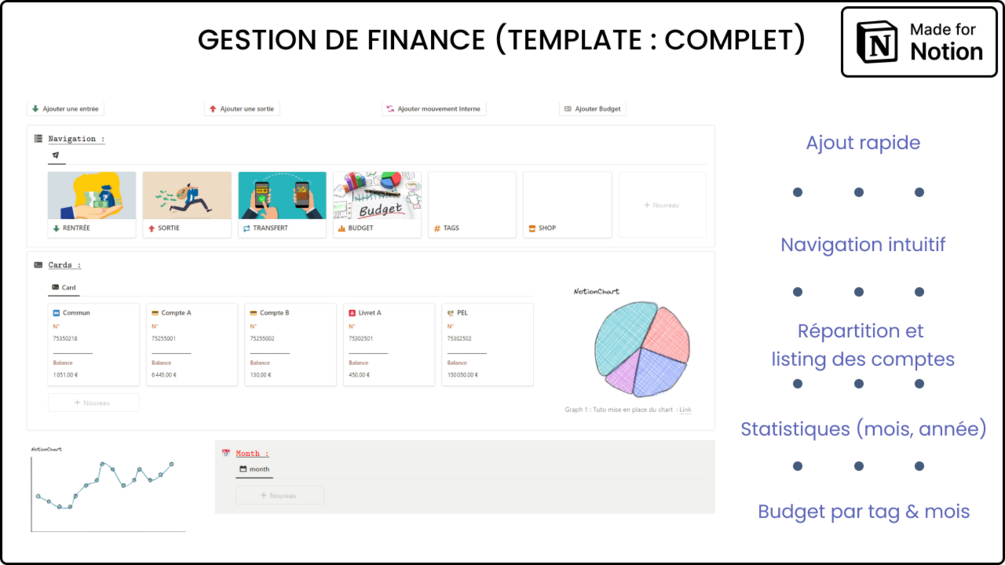 - Chaque entrée ou sortie est liée à un tag qui permet de vite filtrer et voir les dépenses / tag